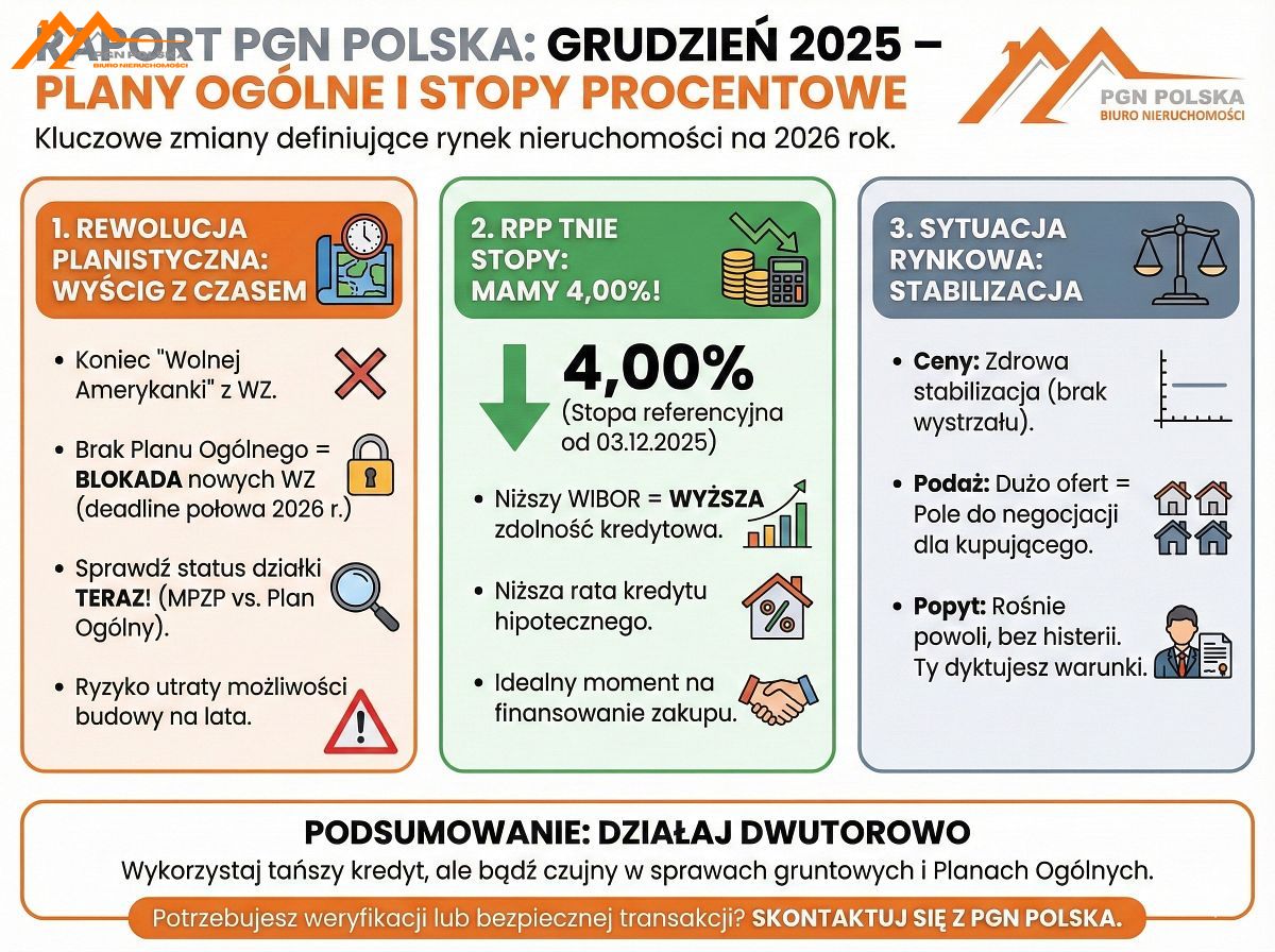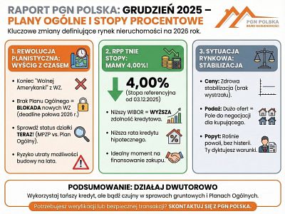 Końcówka roku 2025 wymaga od inwestorów i osób prywatnych podzielności uwagi. Z jednej strony – świetne wieści z banku centralnego zachęcają do kredytów. Z drugiej – niepewność w urzędach gmin wymaga czujności w sprawach gruntowych.